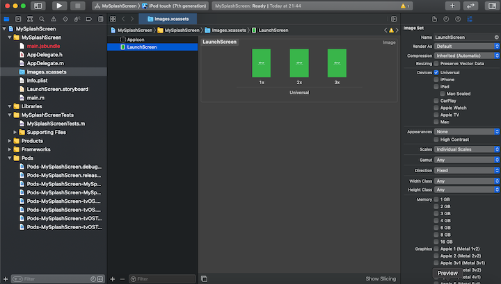 Open the project workspace in Xcode, click images.xcassets, right-click below Appicon, and choose your image. Set the image name to LaunchScreen, open the assets folder, navigate to the Images folder, and open the iOS folder. Inside the splash folder, drag the three images over the three boxes on Xcode named 1x, 2x, 3x: